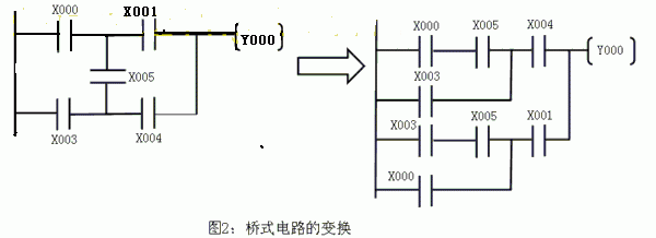 圖(b)中,X001和X002接點控制輔助繼電器M000,X003~X005接點控制輔助繼電器M001,再由兩個繼電器M000,M001接點的并聯組合去控制線圈Y000。這樣邏輯關系沒變,卻把雙線圈變成單線圈。