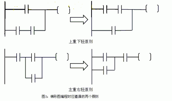 三,并聯塊串聯時,應將接點多的去路放在梯形圖左方(左重右輕原則);串聯塊并聯時,應將接點多的并聯去路放在梯形圖的上方(上重下輕的原則)。這樣做,程序簡潔,從而減少指令的掃描時間,這對于一些大型的程序尤為重要。如下圖所示: