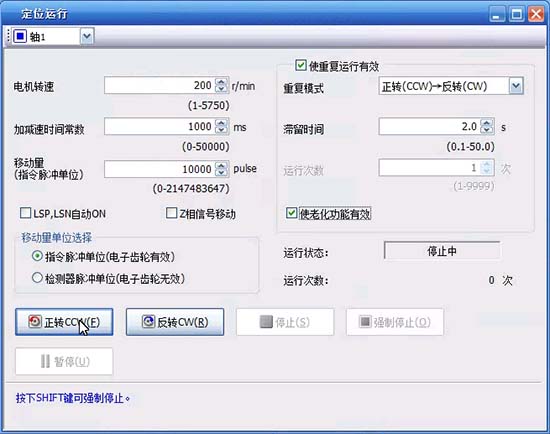 2、 打開<測試運行>菜單下<定位運行>,設置轉速/加減速/移動量,根據實際情況設置,移動量不需要設置太大。打鉤<重復運行有效>和<老化功能有效>,作用是實現重復往復運動,然后點擊運行啟動,這樣電機就可以自動往復運行了,為一鍵式調整做好準備。