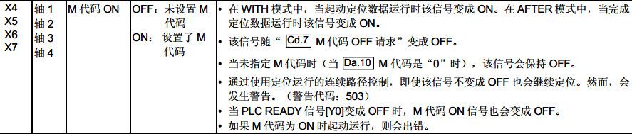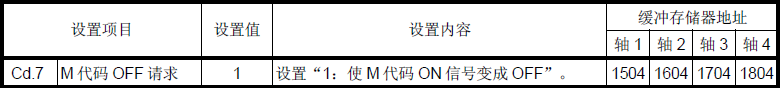 當(dāng)M代碼ON 信號(hào)(X4、X5、X6、X7)為ON 時(shí),必須通過(guò)順控程序使它變成OFF。為了使M代碼ON 信號(hào)變成OFF,在“ Cd.7 M 代碼OFF 請(qǐng)求”中設(shè)置“1”。