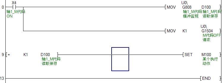 下面是一個(gè)把“ Md.25 有效M代碼”讀入PLC CPU 數(shù)據(jù)寄存器(D110)的順