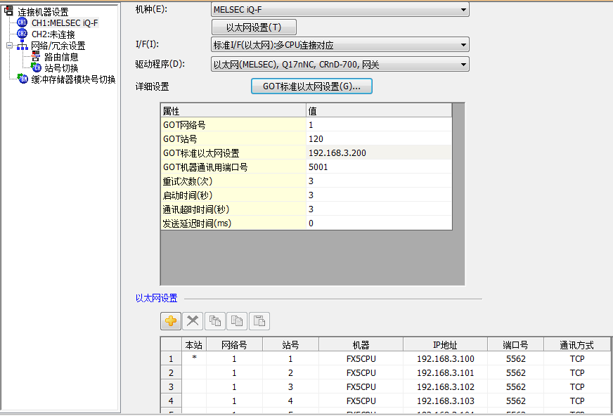 1:三菱觸摸屏IP地址設置、站號設置,連接三菱FX5U系列PLC的IP地址設置、站號設置,保證處于同一個網絡,站號不同即可。
