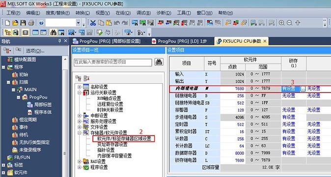 首先在三菱PLC軟件GX Works3中新建一個工程,然后在導航樹狀欄中依次點擊選擇以下欄目內容:【參數】-【FX5UCPU】-【CPU參數】-【存儲器/軟元件設置】-【軟元件/標簽存儲器區域設置】-【內部繼電器】-【有設置】-編輯修改軟元件M和D的鎖存起始和結束范圍。