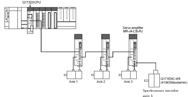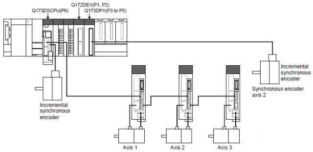 首先在如下圖所示,外部同步編碼器可以通過以下三種方式連接到三菱PLC  Q172DS Motion的控制系統(tǒng)當中。通過外部連接的同步編碼器的輸入脈沖驅動輸入軸,投入電源后就可以監(jiān)控同步編碼器的狀態(tài).