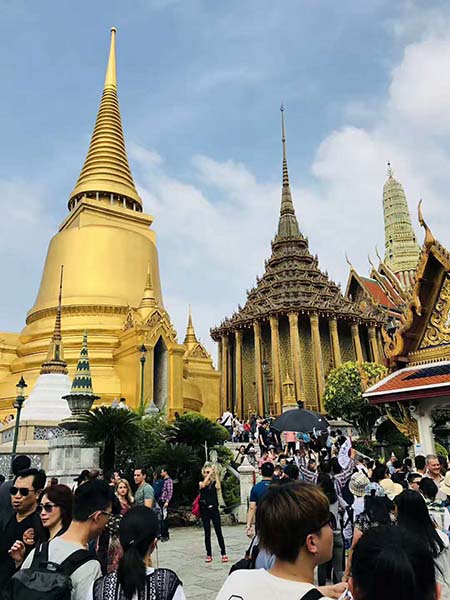 第一站:首先是到泰國必游的大皇宮與玉佛寺,游大皇宮和寺有許多的禮儀規(guī)矩,如:在入大皇宮時(shí),不能穿拖鞋,上衣不能穿無袖下身著裝必須蓋過膝蓋,入寺廟需脫鞋等等,不過在此之前海藍(lán)的小伙伴早就做好相關(guān)的功課,當(dāng)然是順利進(jìn)行游玩,小編提醒:還沒去過泰國旅游的小伙伴在去泰國一定要做好相關(guān)功課,了解當(dāng)?shù)亓?xí)俗文化,不然會(huì)被擋在門外喲!