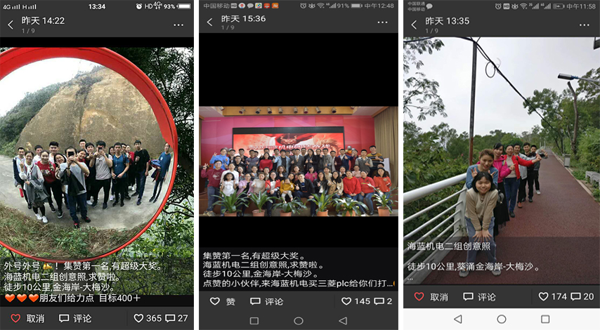 早餐完畢,約摸九點。我們各組便帶上任務開始了徒步之旅,從金海岸徒步至大梅沙食午飯,總程約10公里。大家是不是很好奇,這個任務是什么,竟要徒步10公里來完成,其實這個任務很簡單,就是徒步過程中,各組組員一起完成創意拍照,然后前去朋友圈收集點贊,點贊者最多的組可獲得神秘禮品一份(領導為了我們鍛煉身體也是用心良苦了)。于是我們都使出了各種招兒,讓朋友幫自己點贊,甚至不惜群發騷擾-_- ,這會我想我應該被不少人拉黑了吧。